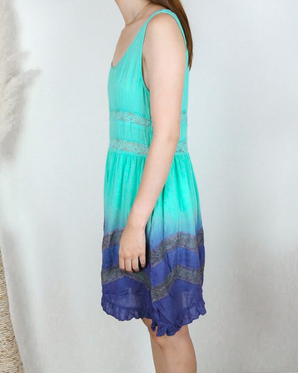 This lovely dress has a mint upper and fades to a navy blue lower. Features lace inset throughout. Partially lined (skirt).