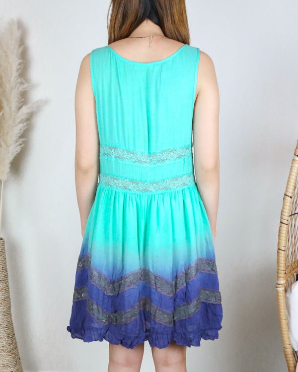 This lovely dress has a mint upper and fades to a navy blue lower. Features lace inset throughout. Partially lined (skirt). imported. oversize relaxed fit